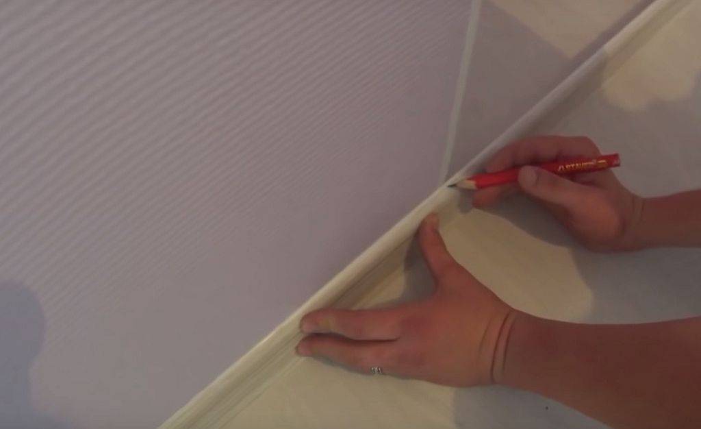 Шаг 1. Монтаж плинтуса можно начинать с любого из углов комнаты. На одну из планок плинтуса надевается уголок. Плинтус ставится вплотную к стене и углу, на месте окончания стены делается пометка карандашом заподлицо в месте отреза лишней части планки. Надетый ранее уголок снимается.