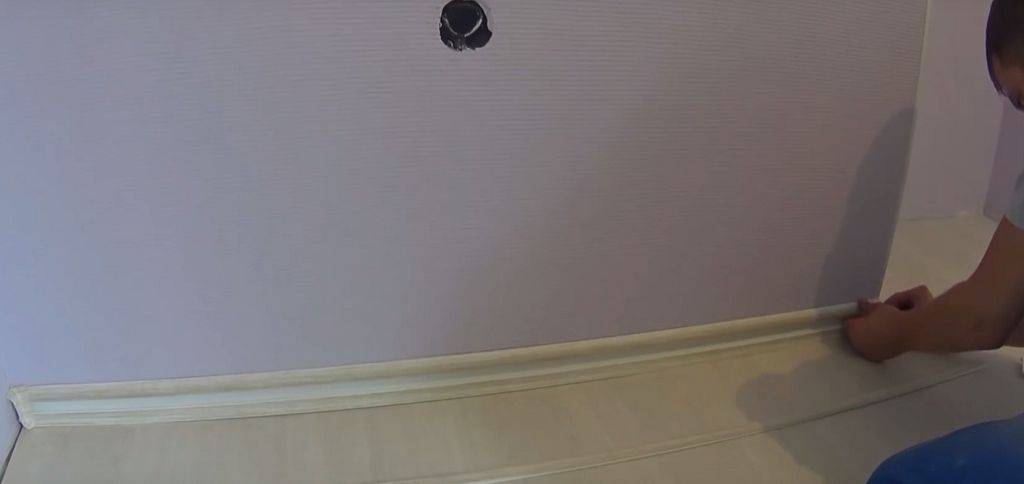 Шаг 4. Уголок вновь надевается на край плинтуса, планка прикладывается к стене. С другой стороны плинтуса будет надеваться либо внешний уголок, либо заглушка.