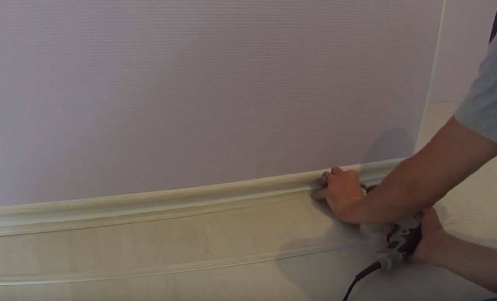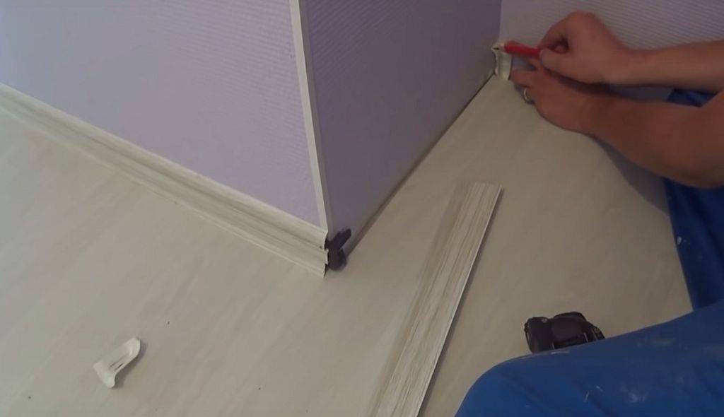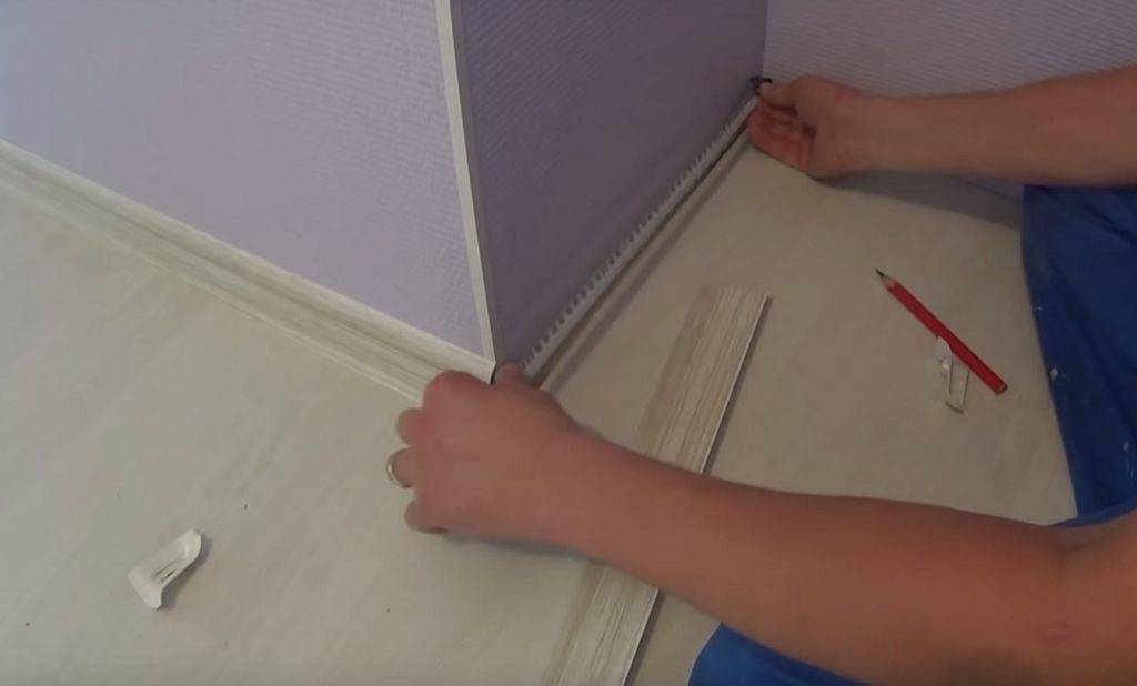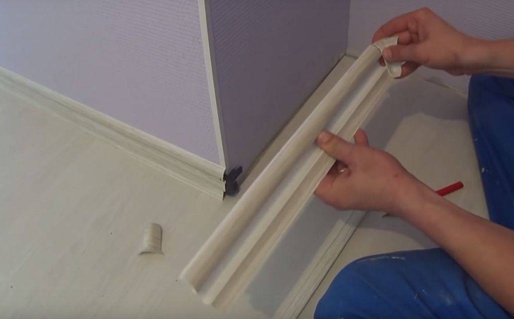 Перед монтажом плинтуса укладывается напольное покрытие, отделываются стены. Монтаж плинтуса пластикового производится следующим образом.
