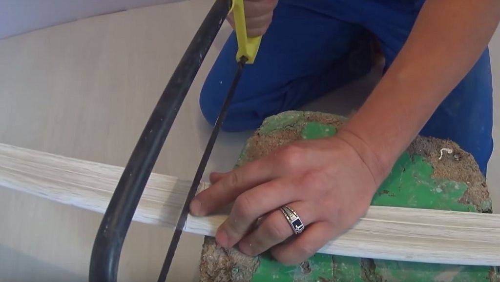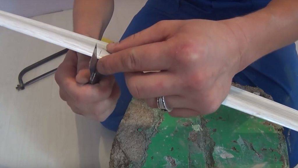 Шаг 2. Для отреза плинтуса используются канцелярский нож и ножовка по металлу. Если у плинтуса внутренний и внешний края резиновые, то для начала они надрезаются ножом – ножовка может их порвать. Далее по карандашной отметке плинтус распиливается ножовкой.