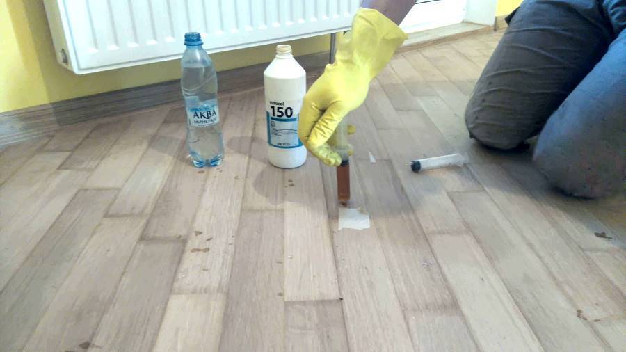 В ситуации, когда «стонут» лишь отдельные элементы покрытия, можно решить вопрос без снятия ламината. Для того чтобы избавиться от посторонних звуков достаточно просверлить в проблемной зоне сквозное отверстие и через него с помощью шприца ввести под ламель клей ПВА (сколько поместится). Через 2 дня, в течение которых наступать на дефектную область нельзя, состав подсохнет и скрип исчезнет. Останется лишь замаскировать отверстие специальной затиркой для ламината или шпаклёвкой по дереву соответствующего оттенка.