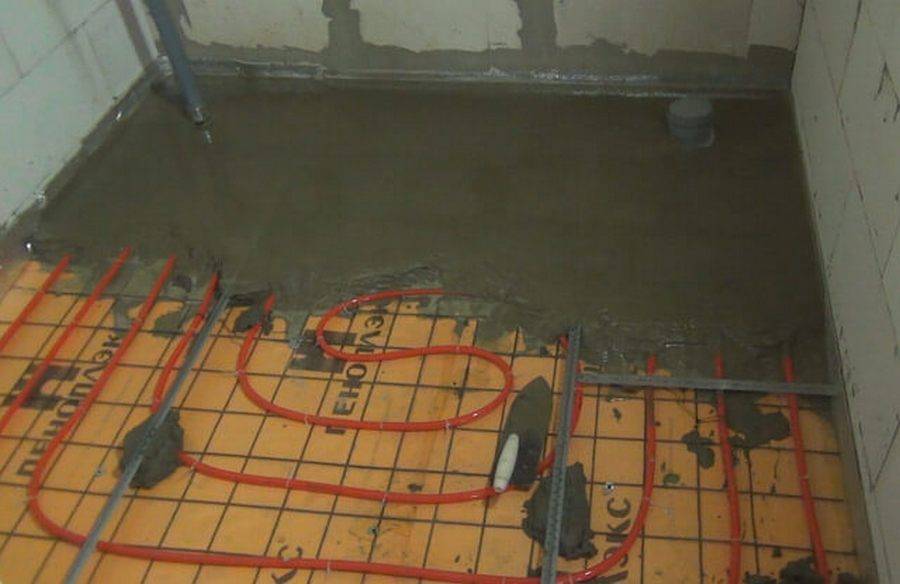 Толщина раствора по водяному полу должна составлять пять–шесть сантиметров, из них три–четыре сантиметра должно находится под трубками.
