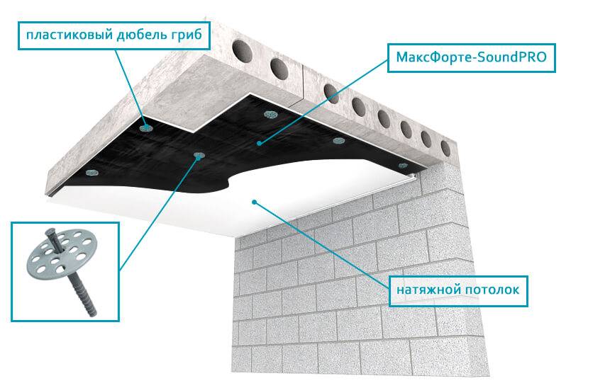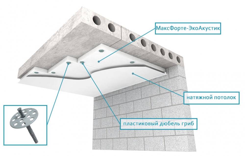 При шумоизоляции натяжного потолка стоит основная задача заполнить пустое пространство между плитой перекрытия и полотном натяжного потолка специальным звукопоглощающим материалом, который: