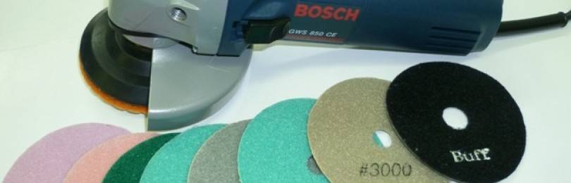 Полировка — следующая операция после шлифовки, когда поверхность выровнена и готова к полировке. Для полировки гранита нам понадобится маленькая болгарка с регулировкой оборотов(обязательно). Порекомендую вот эту — болгарка с регулировкой оборотов Bosch GWS 850 CE. Вообще, полировка гранита очень схожа с полировкой мрамора, даже насадки применяют точно такие же — АГШК(алмазные гибкие шлифовальные диски), еще их называют «черепашки». Вся разница в том, что насадок требуется гораздо больше, чтобы довести гранит до состояния зеркального блеска. Если полировку мрамора можно заканчивать на насадке зернистостью 800, то гранит при обработке его 800 насадкой еще даже не начинает блестеть, он пока матовый. После 800 гранит полируют насадками 1500, 3000 и Buff.