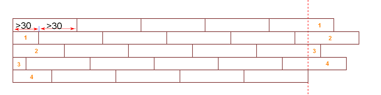Хаотичной данная раскладка может получиться только в том случае, если при заканчивании ряда остается слишком короткий обрезок — придется вставлять произвольный кусок. Или же есть множество остатков от предыдущей укладки и их необходимо использовать. Главное условие: нужно соблюдать минимальное смещение поперечных швов по отношению к предыдущему ряду — обычно производитель указывает эту величину и она составляет 30-40 см.