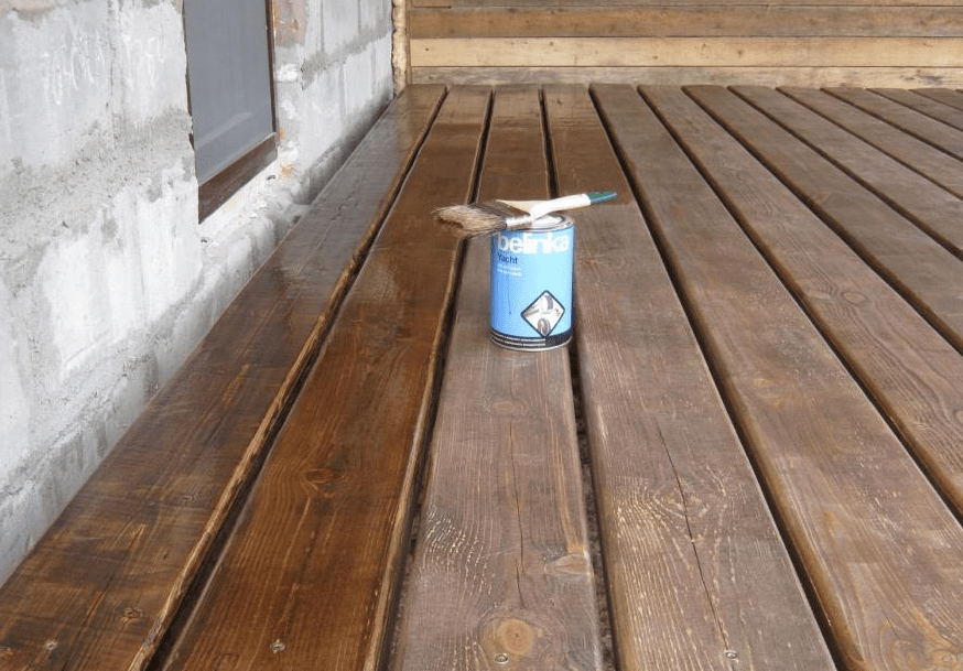Необходимо учитывать, что даже при идеальном монтаже досок неподготовленное дерево настила веранды не будет защищено от разрушения. Различные краски и лаки подбираются в зависимости от вида укладываемого покрытия. Обычно полы на верандах изготавливаю из сосны. Она должна иметь естественный уровень влажности