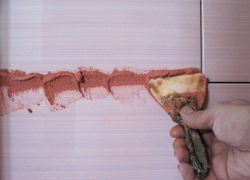 - смесь наносится резиновым шпателем – на шов выкладывается ее небольшой объем;