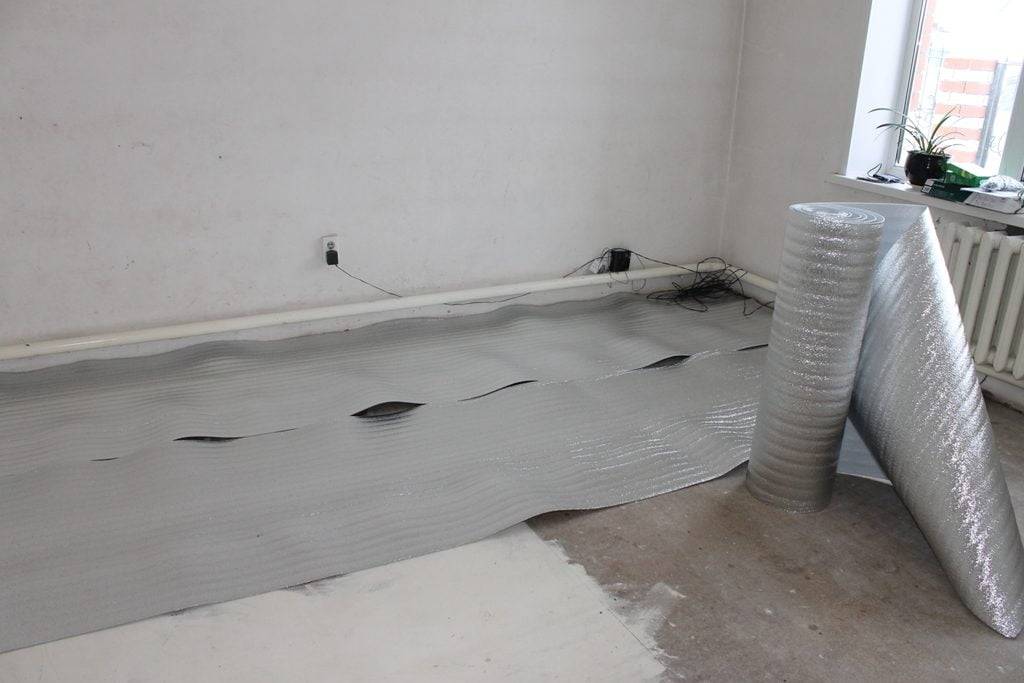 Чтобы тепло от нагревательных элементов не уходило в перекрытие, на основание пола укладывается утеплитель. Многие сайты рекомендуют использовать фольгированные материалы, что на взгляд редакции портала StroyGuru является рекламным ходом. Ведь в закрытом пространстве (уложена стяжка) отражающий эффект не наблюдается. Нужен зазор, которого нет.