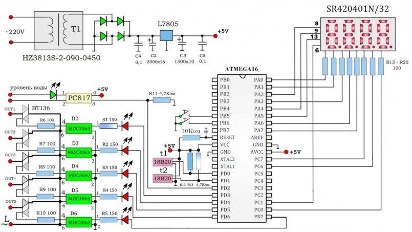 При остывании датчика термометра ток в плечах терморегулятора уравняется, и электронный блок выдаст управляющий сигнал на отключение. Приведенная электронная схема работает в двух устойчивых состояниях – отключенном и включенном, чередование рабочих режимов происходит в соответствии с заданной логикой.