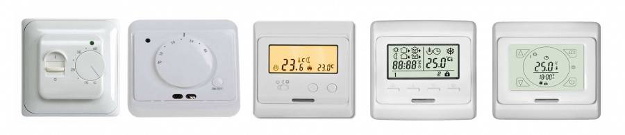 Регуляторы температуры полов могут быть вставленными в подрозетник или закреплёнными на стене. Термодатчик бывает, как встроенным в корпус прибора, так и установленным на конце выносного кабеля.