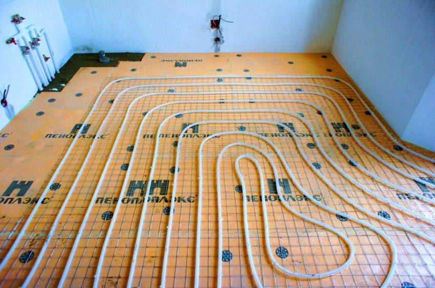 На этапе укладки сетки при необходимости монтируют систему теплого пола. Поверхность пеноплекса позволяет использовать для фиксации труб теплоносителя специальные пластиковые скобы.