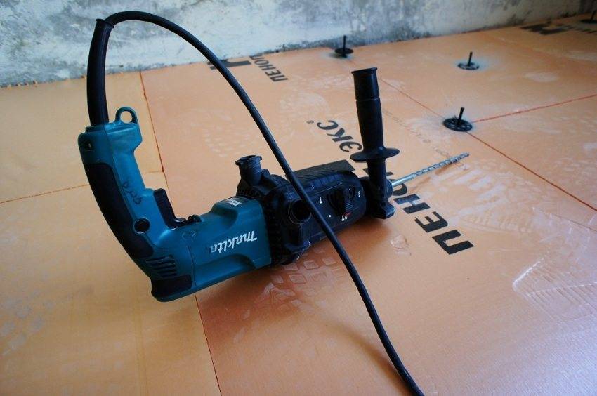 Чтобы подробнее рассмотреть этот случай возьмем пример с бетонным основанием. Если квартира не находится на первом этаже здания, то толщина утеплителя может быть менее 5 см. Этого вполне достаточно. Перед началом основных работ по укладке пеноплекса под стяжку пола производят полный демонтаж старого покрытия. Если была цементная стяжка, то удаляют и ее при помощи перфоратора. Затем плиты перекрытий освобождают от грязи и пыли, заделывают все неровности и запенивают отверстия от инженерных коммуникаций.