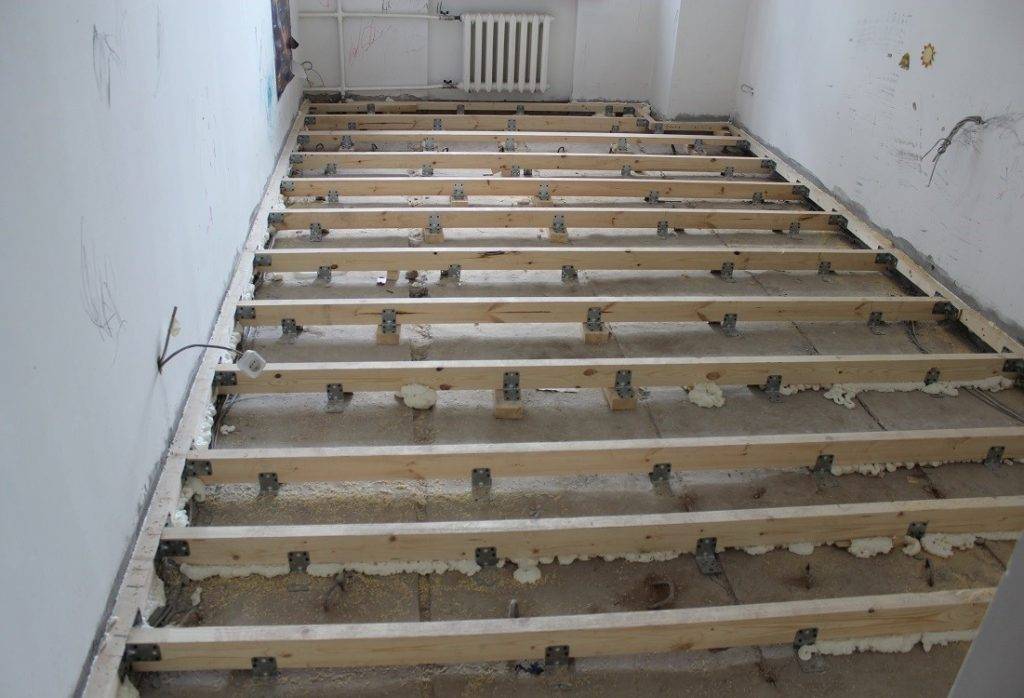 Поверх бетонной плиты с шагом 40…60 сантиметров устанавливаются лаги – брусья, имеющие толщину более 75 мм, и высоту, обеспечивающую укладку между ними теплоизоляционного материала нужной толщины. Лаги фиксируются шурупами-саморезами на нагелях, уголками, гнутыми из жести, деревянными коротышами.