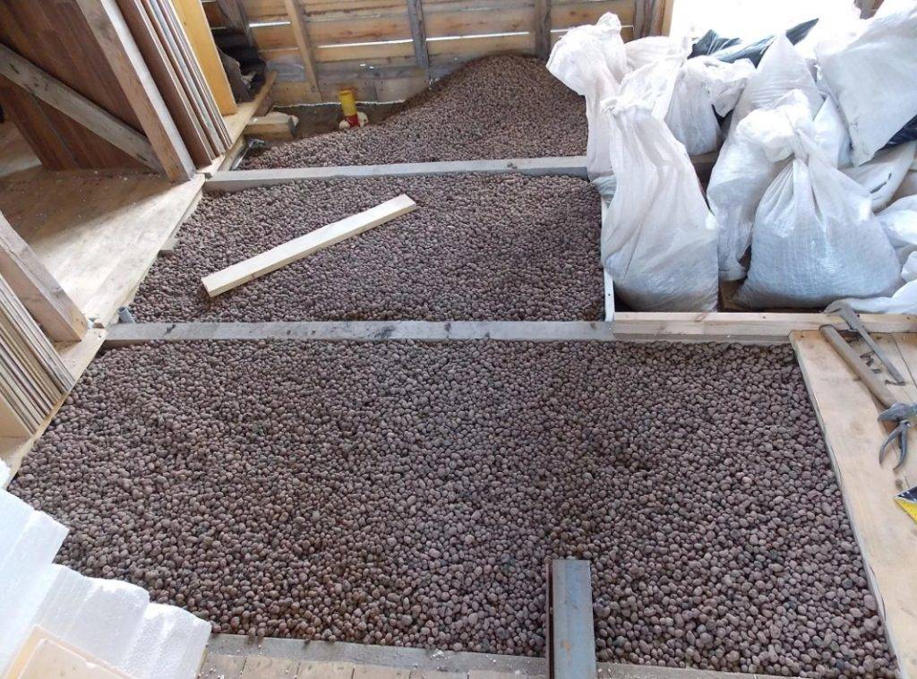 Для утепления пола в деревянном доме первым делом нужно сделать керамзитобетонное основание. Для этого потребуется распределить керамзит между маяками и после этого залить все цементным молочком. Это необходимо для обеспечения схватывания стройматериала между собой. После проведения работ по стяжке можно ходить спустя 24 часа.