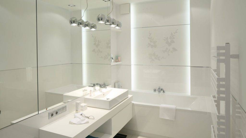 Если есть желание увеличить комнату визуально, можно переделать освещение на точечное, повесить зеркало без рамки. Так ванная комната станет на вид гораздо легче и комфортнее. Также саму ванну можно заменить душевой кабиной с прозрачными дверцами.