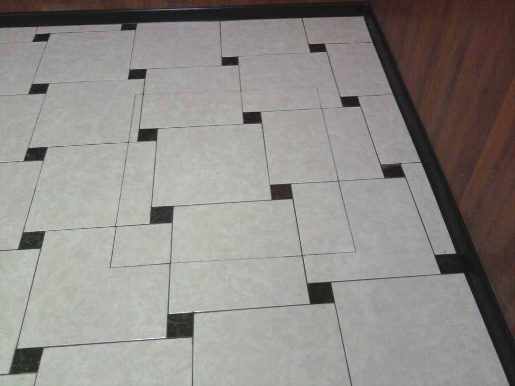 Этот рисунок хорошо подходит для больших комнат или поверхностей, которые не будут заставлены другими предметами. Его суть состоит в том, что зоны в комнате выделяются квадратами плитки другого цвета. Можно выделять как центральную часть помещения, так и несколько частей, или какие-то дорожки. Вставки могут состоять как из одной плитки, так и из 4, 8, 16 в зависимости от размеров комнаты.