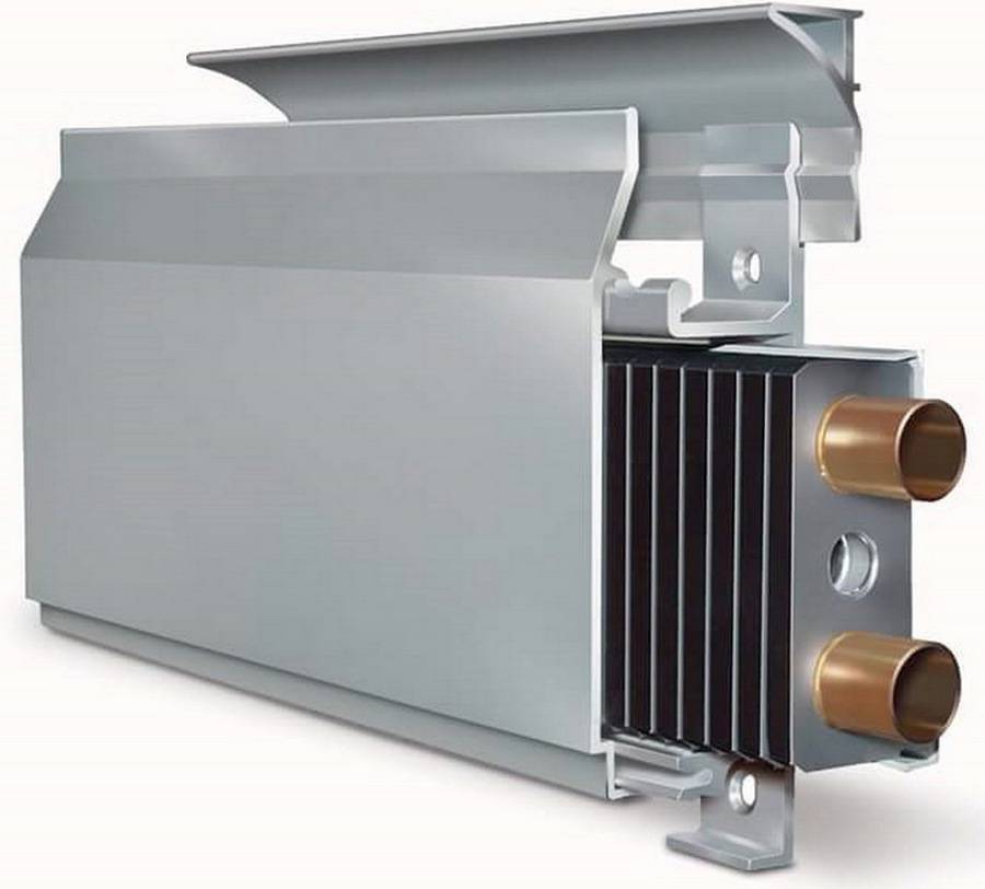 Еще одна модель, предназначенная для дизайнерских проектов. Отопительный прибор изготовлен из горячепрессованного алюминиевого сплава, внутри которого установлены латунные и медные трубы. В связи с тем, что модель является жидкостной, монтаж лучше производить после предварительных теплорасчетов. Большинство специалистов рекомендует использовать данный плинтус для дач и загородных домов.