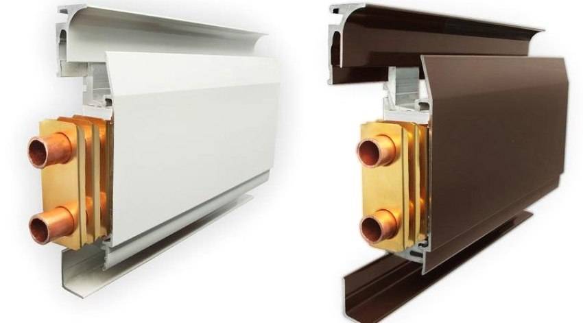 Материалы для производства используются самые теплопроводные и, соответственно, дорогие — алюминий, медь, латунь. Внешне термоплинтус представляет собой короб из алюминия, внутрь него помещен греющий элемент — две медные трубки с нанизанными на них латунными, медными или алюминиевыми пластинками (ламелями).