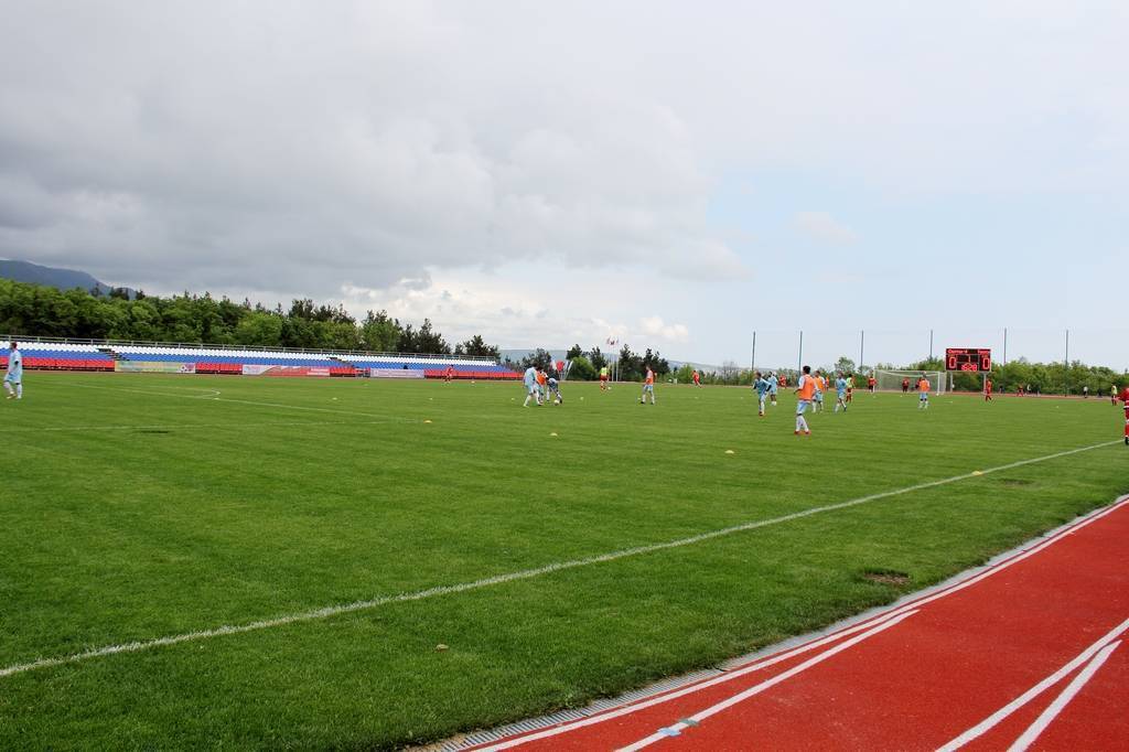 Далее на мини футбольное поле укладывали покрытие предотвращающее попадание воды на стабилизацию и сверху искусственное травяное покрытие. По беговым дорожкам асфальтобетон, после того как он набрал прочность, клеили резиновое покрытие.