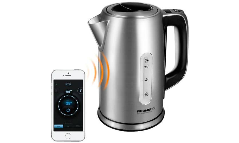 Это первый Смарт-чайник в рейтинге. Его объём – 1,7 л. Мощность – 2400 Вт. Дизайн у него стандартный, корпус металлический, внутри — пластик не лучшего качества, имеет неприятный запах. Встроен фильтр и функция блокировки включения с пустой ёмкостью. Есть терморегулятор, который может нагреть воду до определённого значения температуры и её поддерживать. Чайник автоматически отключается при снятии с подставки. Есть индикатор уровня воды, расположен удобно, а не как в Tesler KT-1755 или Tefal KL 270D. Главная «фишечка» этого чайника – удалённое управление со смартфона на Android или iOS. Можно управлять как по Wi-Fi, так и по Bluetooth. Пользователь сможет выбрать нужную температуру (необязательно кипения) и время её поддержания (до 12 часов) — чайник дома всё сделает, вы домой пришли – кружечку кофе заварили. Цена – 4300 рублей.