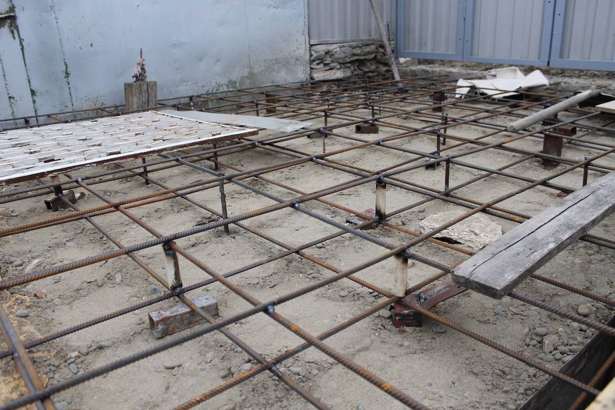 Для бетонирования применяют армированные металлические прутья диаметром 10 мм. В тех местах, где они пересекаются, арматуру фиксируют между собой стальной проволокой. Сварку нельзя применять. Арматура обязана несколько возвышаться над слоем щебня, хотя бы на пару сантиметров. Тогда она точно окажется внутри бетонной стяжки. Чтобы приподнять пояс металла, используют подпорки.