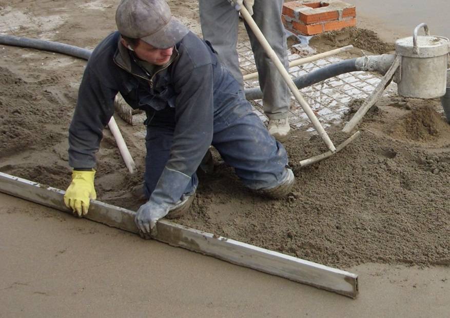Как бы ни готовился или приобретался раствор, он наливается подготовленную к работе площадь толщиной чуть выше маячков. Далее, правилом, не сильно прижимая его к маячкам ведут, выравнивая поверхность. Затем добавляют бетон и продолжают выравнивание. Если стяжка требуется очень толстая, то выложенный и предварительно распределенный раствор рекомендуют протыкать штыковой лопатой – это позволит избежать случайных воздушных полостей.