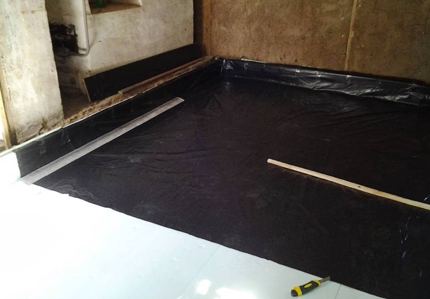 - Пароизоляцию нужно уложить с нахлестом на стены. Если не сделать этого слоя, то влага из грунта попадет в конструкцию чистового пола и сконденсируется там.