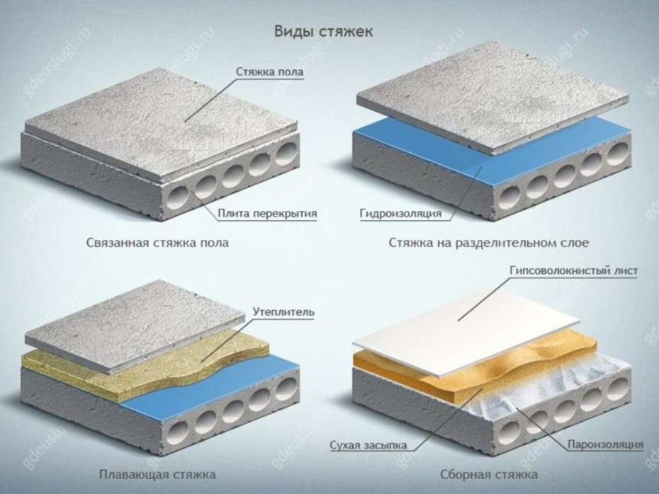 Состав, конструкция, способ укладки и сцепления с основой промежуточного слоя в структуре пола могут быть разными. Применяются следующие виды стяжки: