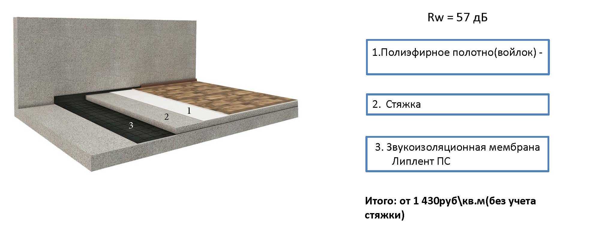 Самый простой и эффективный вариант – «Базовый Плюс». Под стяжку укладывают звукоизоляционную мембрану «Липлент ПС», а сверху – полиэфирное полотно (войлок). Это повысит индекс шумоизоляции на 57 дБ и обойдется в такую сумму (цены здесь и далее указаны по состоянию на первый квартал 2020 г.):